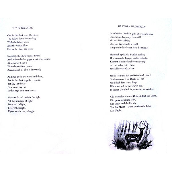 Edward Thomas was killed in France in 1917, but he was not a “war poet”. Instead his poetry tells of the personal conflict that took place in his own heart between the harsh demands of the outer world, in which he always felt himself a stranger, and a deep longing for peace within his troubled spirit. This peace he sought continually, but experienced it only in the realm of nature, in the English countryside. This book presents a selection of Thomas’s finest poems, translated into German for the first time, with the English text and illustrated by a new series of evocative drawings by Peter Sullivan.