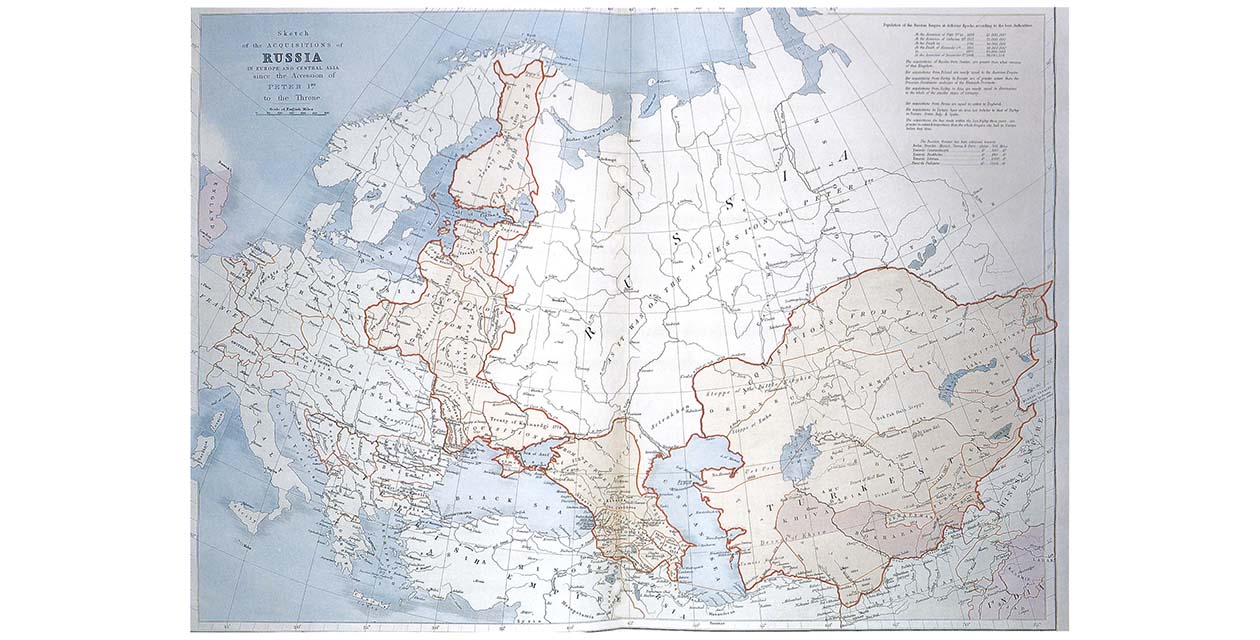 European anxieties about Russia have a long history. This map appeared in the 1887 edition of Stanford’s London Atlas, but it goes back even further, for it was originally drawn to illustrate Sir John MacNeill’s book, The Progress and Present Position of Russia, published in 1836. MacNeill’s knowledge had come from his time as British envoy to Tehran, and his book was a polemical work warning against Russian expansionism. It evidently struck a nerve in Victorian England. Mistrust of Russia became a deep and continuing theme in British foreign policy.